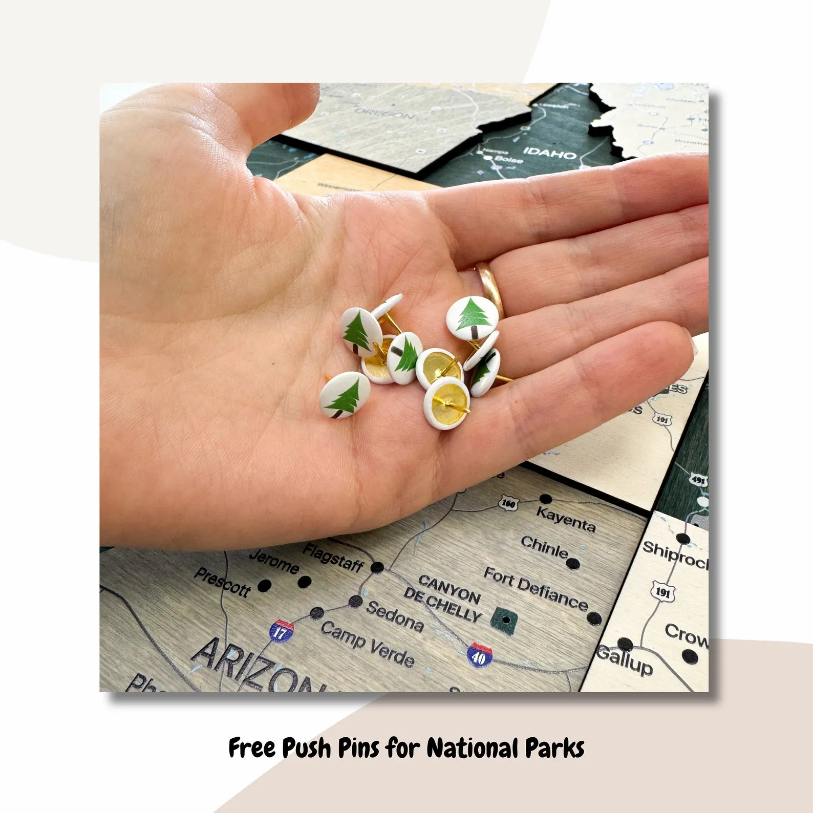 This wooden USA map is designed as a national park push pin wall display for travelers who enjoy exploring nature. The map presents the outline of the country on a wooden base with a clean and simple look that fits many decor styles, from rustic and farmhouse to modern apartment interiors. It can be placed in living rooms, hallways, study areas or vacation homes.