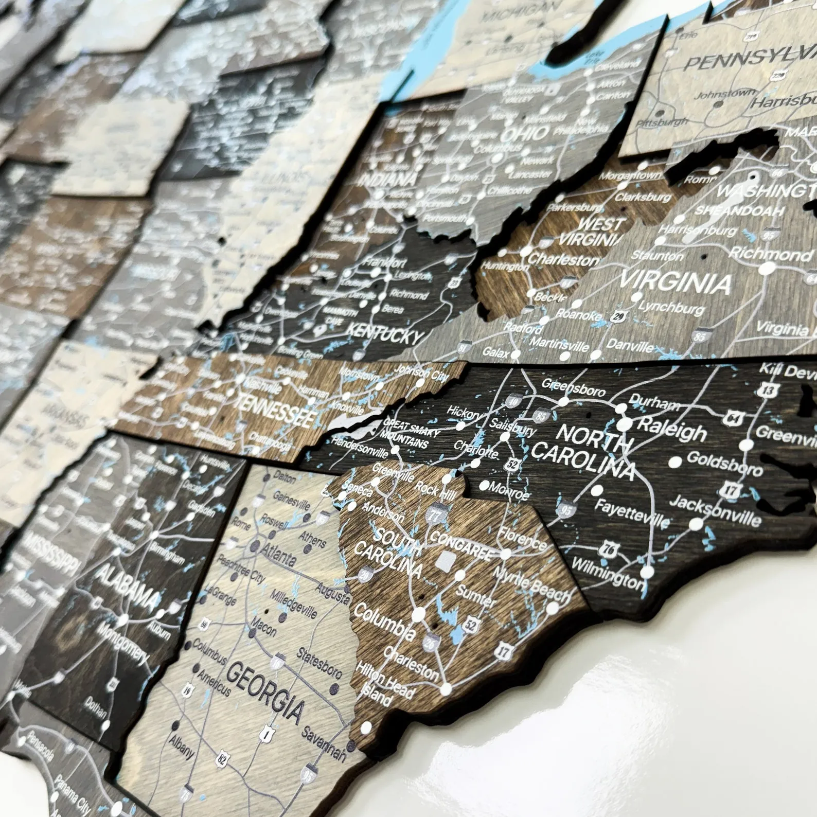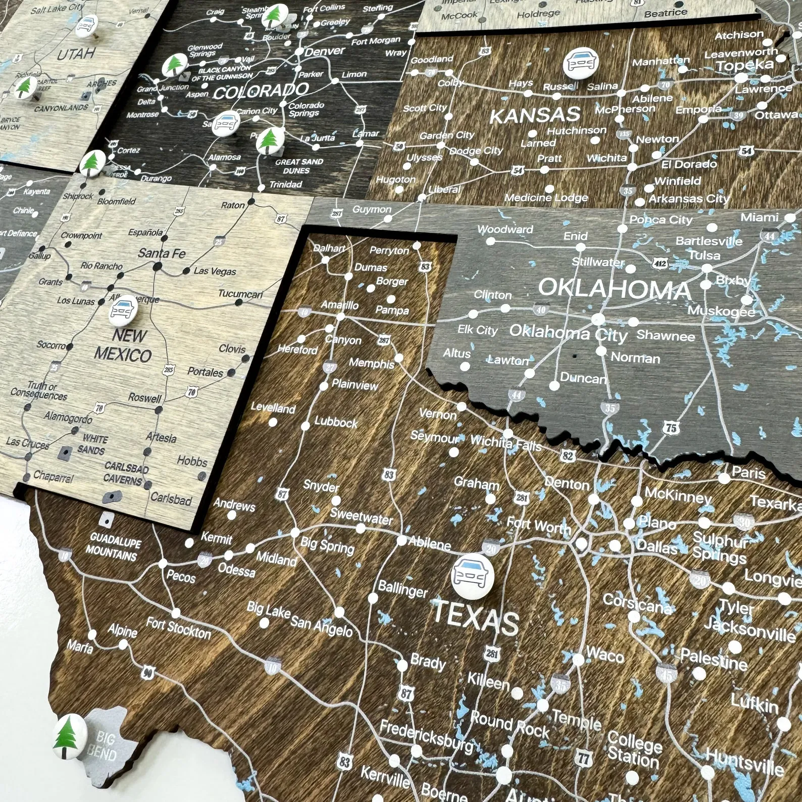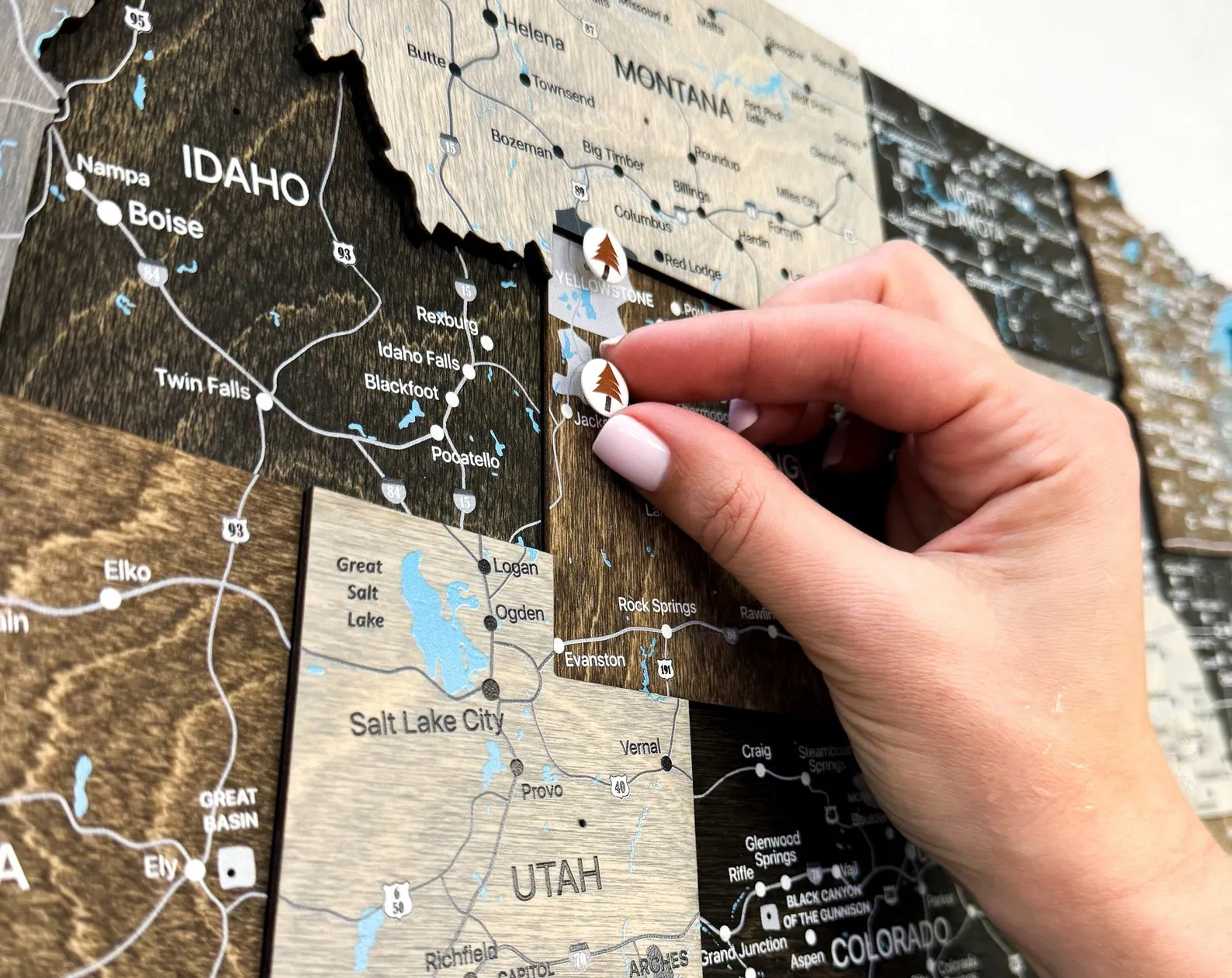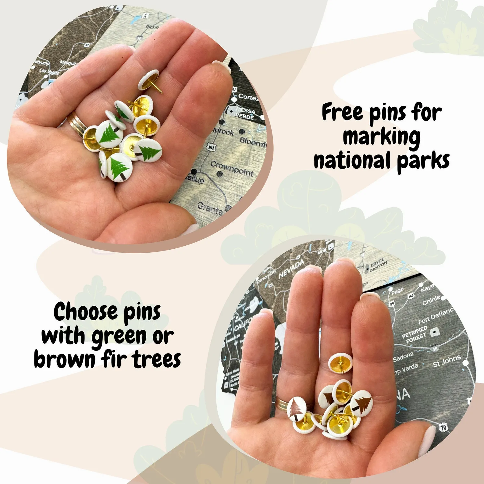 This wooden USA travel map is made for displaying trips to national parks and other outdoor destinations. The natural wood base gives the map a warm and inviting look that suits cabins, guest rooms, family living spaces and home offices. Its simple outline of the United States keeps the focus on your pins and travel notes rather than heavy decoration.